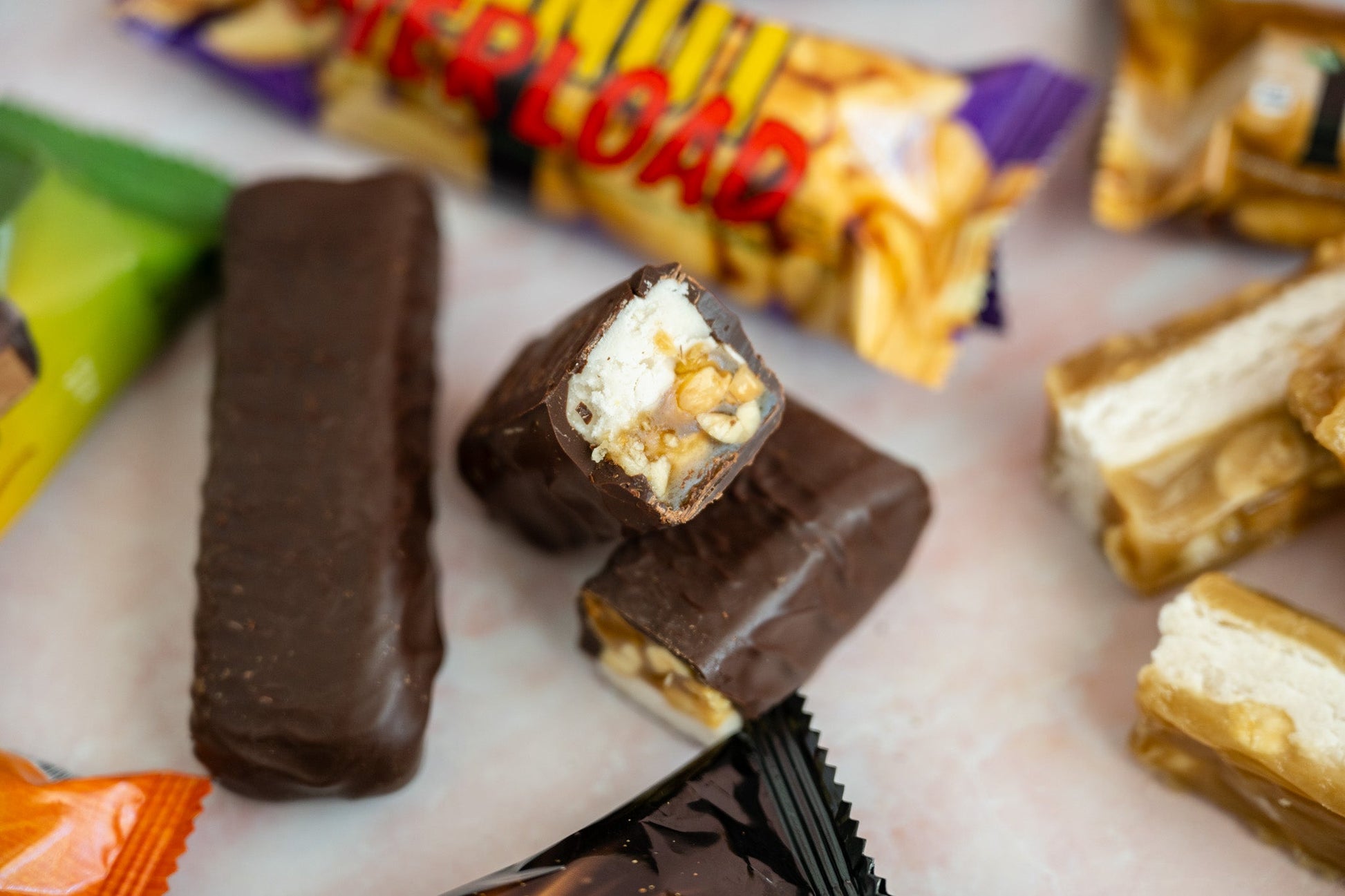 A delightful treat with layers of chocolate, peanuts, nougat, and caramel